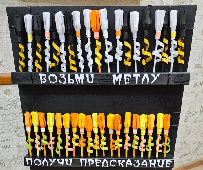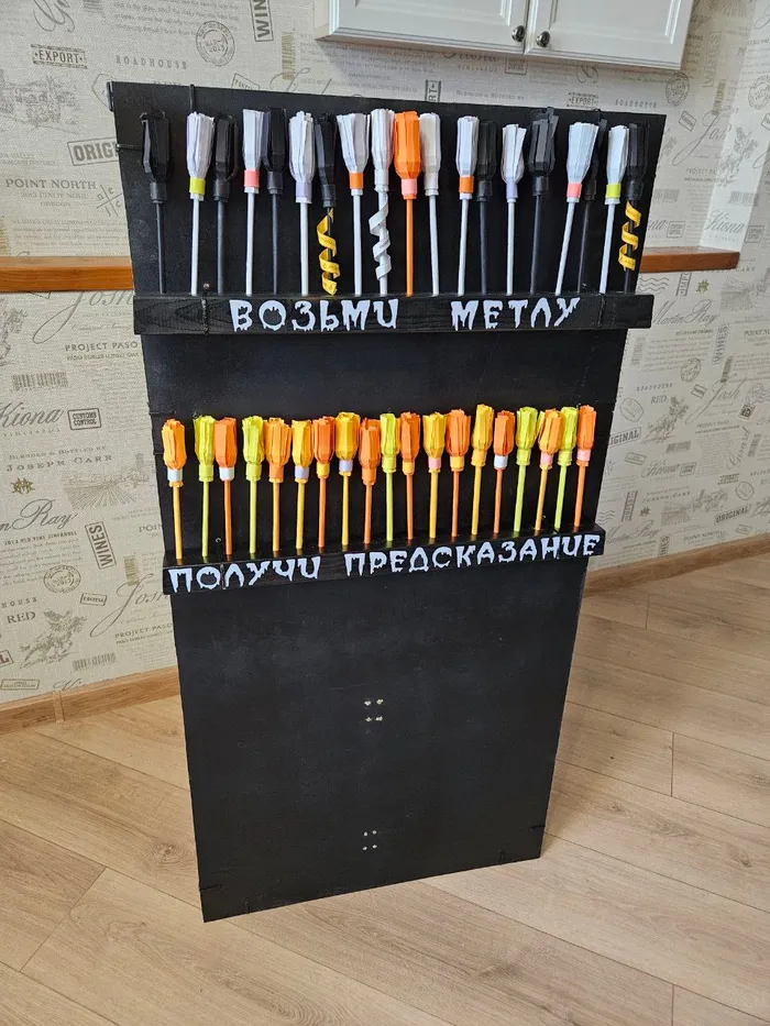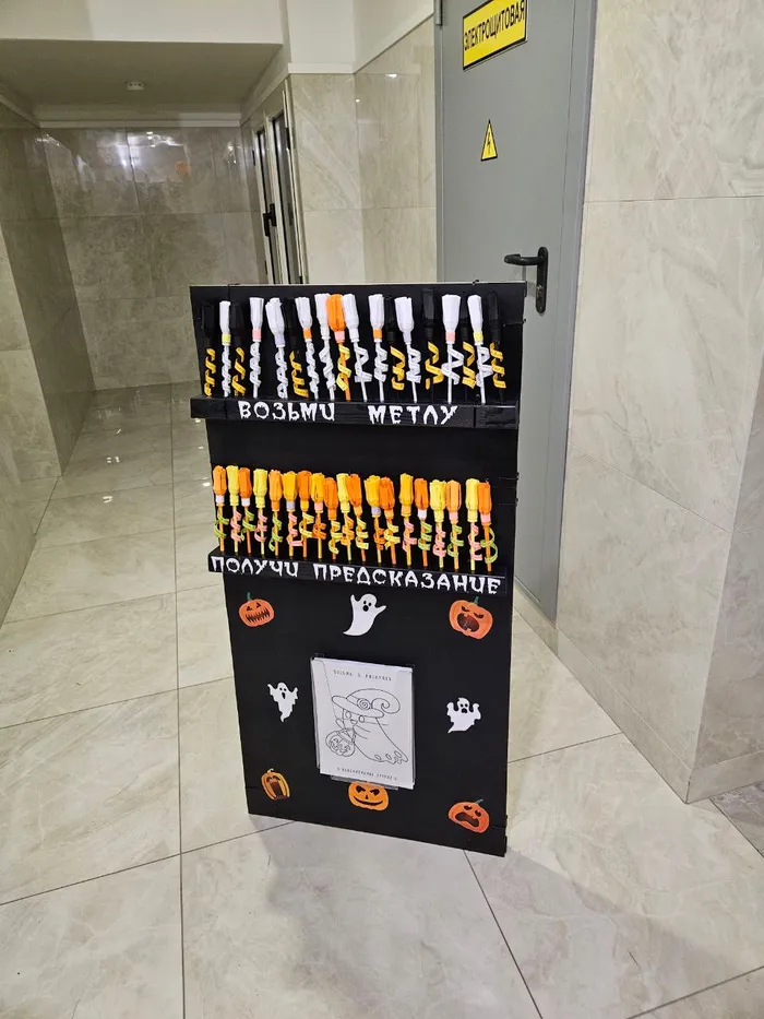 Немного об ужасающих результатах. Помимо страшно полученного удовольствия от самой работы, под видом предсказаний были продвинуты необходимые пожелания и информация для жителей дома (Прямо дьявольское изобретение). Все метлы со стенда закончились уже к вечеру. Вторая партия метел ушла к следующему утру. Окончательно заправляли стенд уже просто листочками с предсказаниями без метелок и их тоже смели. Раскрасок было заготовлено с большим запасом и их за три дня все не разобрали, но стенд еще стоит )